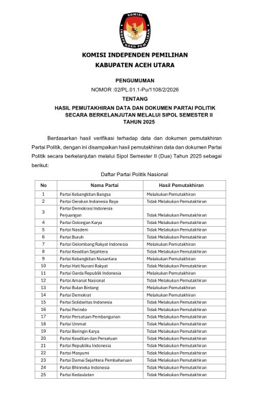 PENGUMUMAN NOMOR : NOMOR :02/PL.01.1-Pu/1108/2/2026 TENTANG HASIL PEMUTAKHIRAN DATA DAN DOKUMEN PARTAI POLITIK SECARA BERKELANJUTAN MELALUI SIPOL SEMESTER II TAHUN 2025