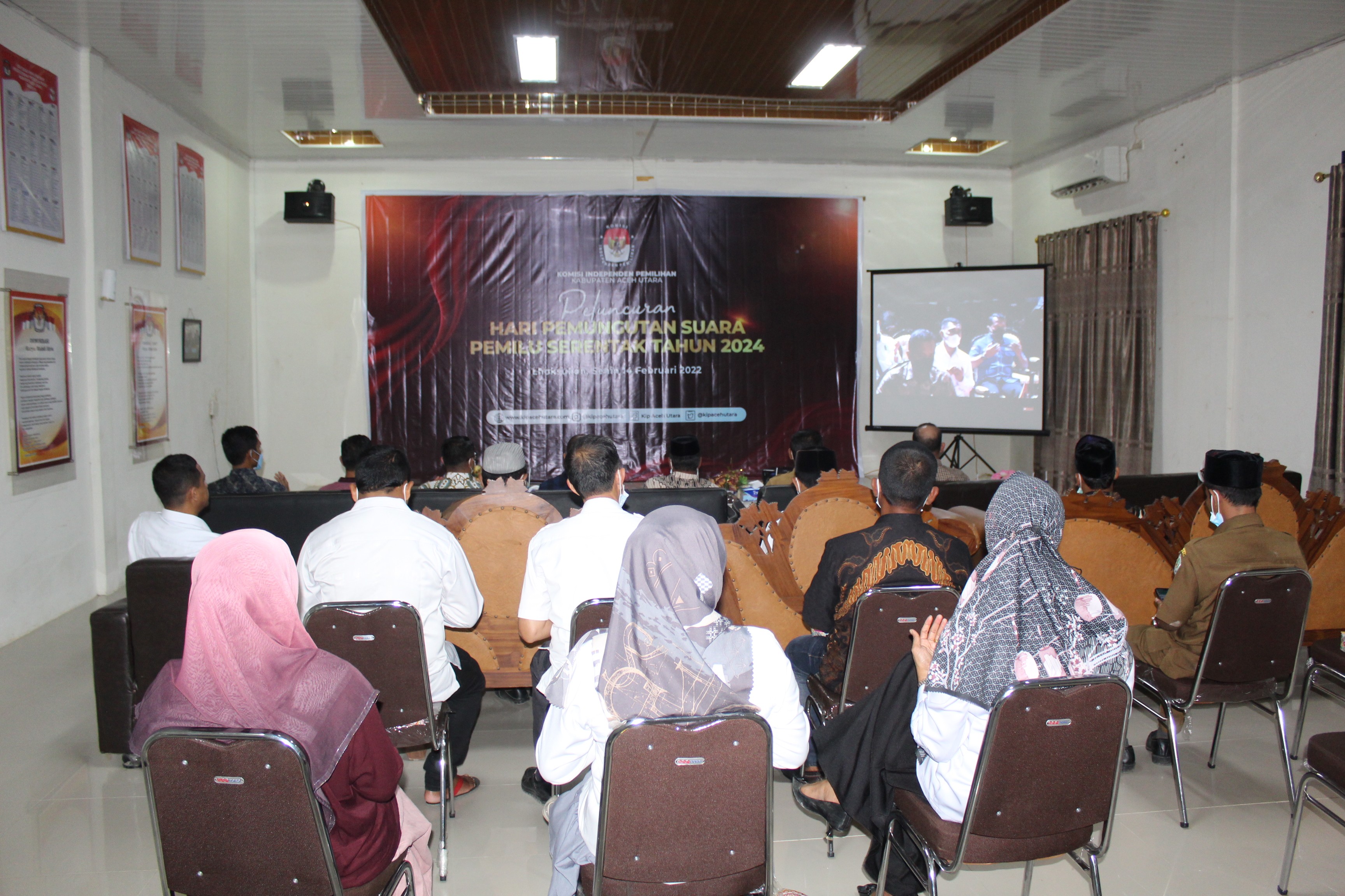 ACEH UTARA- Komisi Independen Pemilihan (KIP) Kabupaten Aceh Utara melaksanakan kegiatan nonton bareng 'Launching Hari Pemungutan Suara Pemilu Serentak Tahun 2024', di Aula Kantor KIP setempat, Gampong Alue Mudem, Kecamatan Lhoksukon, Aceh Utara, Senin, 14 Februari 2022, malam.