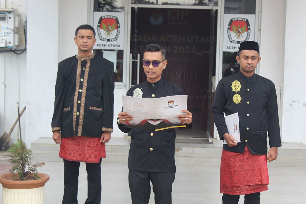 Anggota KIP Kabupaten Aceh Utara Muhammad Al Khalidi yang menjadi Inspektur Upacara dan yang bertindak sebagai Komandan Upacara Kasubbag Keuangan, Umum dan Logistik Muhammad Yusrian.