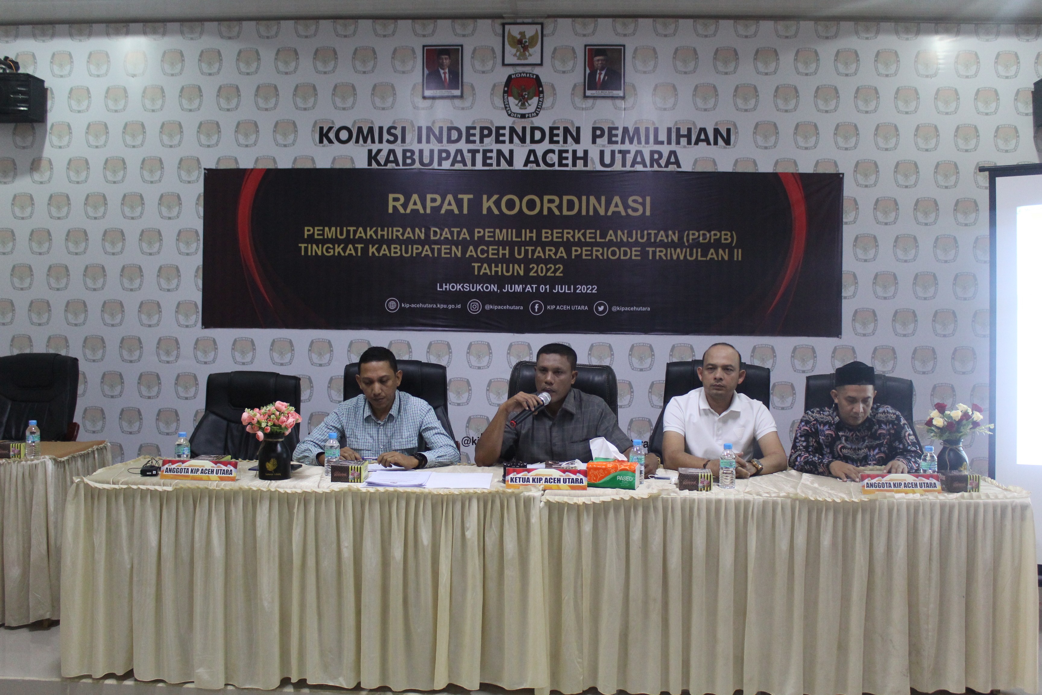ACEH UTARA- Komisi Independen Pemilihan (KIP) Kabupaten Aceh Utara, melaksanakan Rapat Koordinasi Pemutakhiran Data Pemilih Berkelanjutan (PDPB) Tingkat Kabupaten Aceh Utara periode Triwulan II Juni 2022 secara luring, di Aula Kantor KIP Aceh Utara, Jum’at 01 Juli 2022.