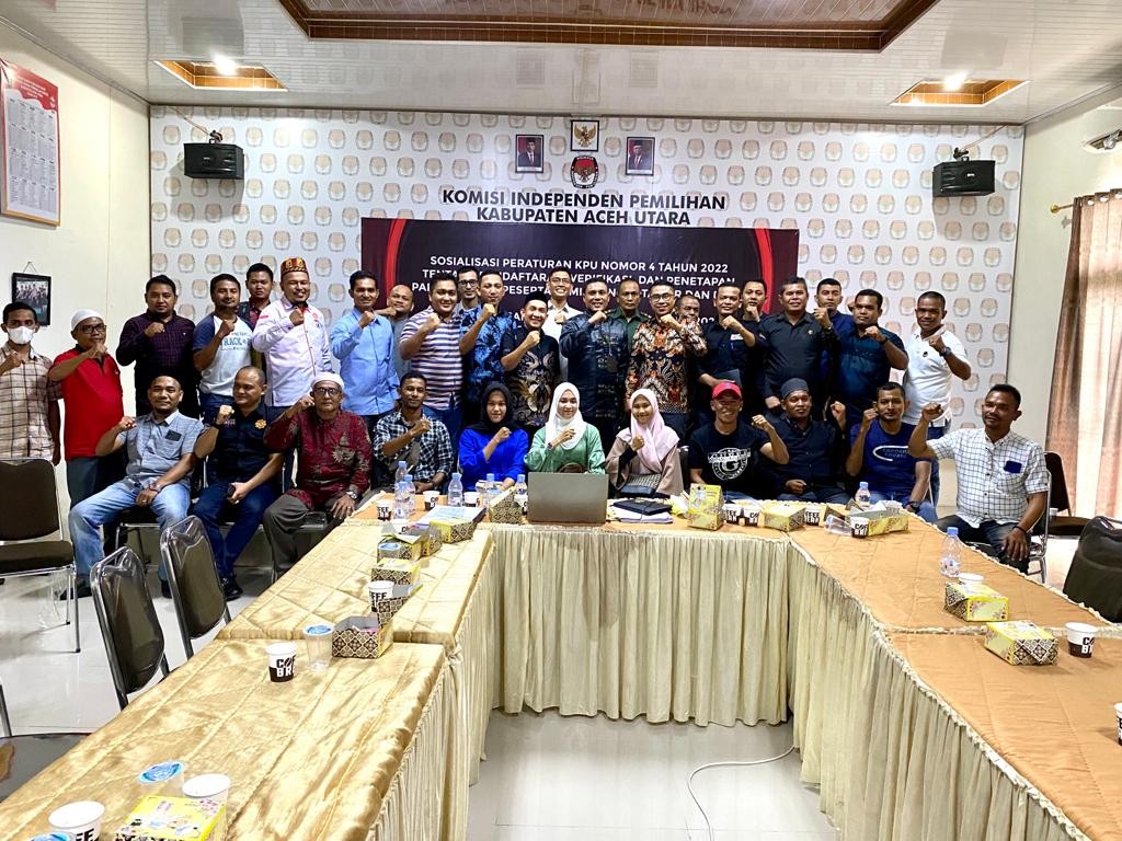 Komisi Independen Pemilihan (KIP) Aceh Utara melaksanakan sosialisasi mengenai Peraturan Komisi Pemilihan Umum (PKPU) Nomor 4 tahun 2022 tentang Pendaftaran, Verifikasi dan Penetapan Partai Politik Peserta Pemilu Anggota DPR dan DPRD dan Keputusan KIP Aceh Nomor 20 Tahun 2022 tentang Pendaftaran, Verifikasi dan Penetapan Partai Politik Lokal Peserta Pemilu Anggota DPRA dan DPRK Tahun 2024, di Aula Kantor KIP setempat, Kamis (4/8/2022).