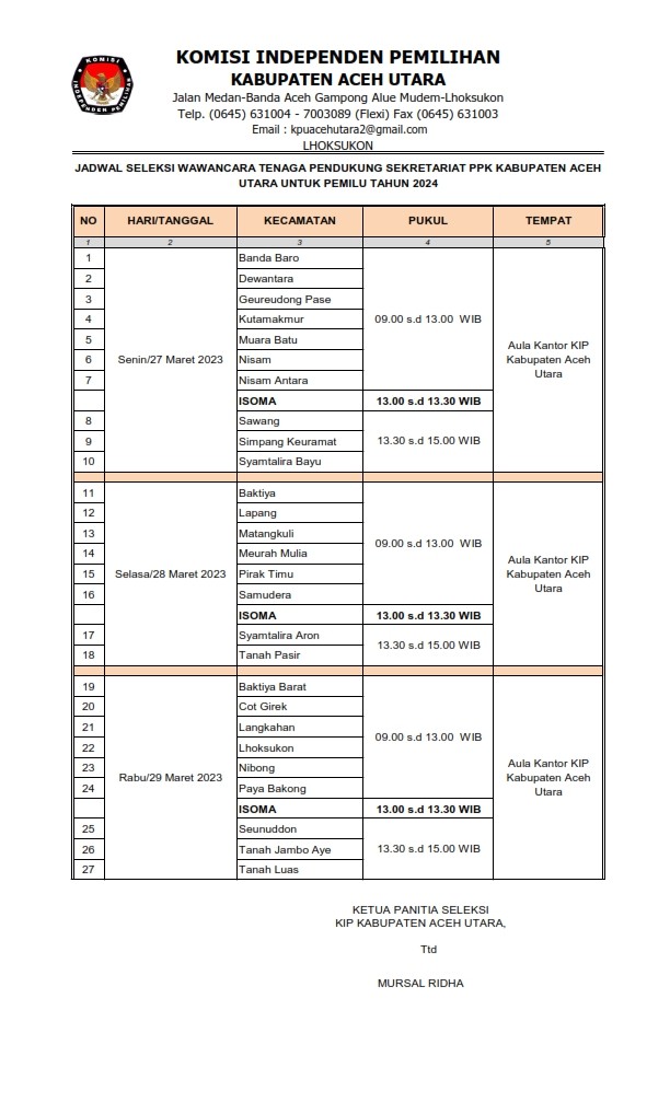 PENGUMUMAN JADWAL SELEKSI WAWANCARA TENAGA PENDUKUNG SEKRETARIAT PPK KABUPATEN ACEH UTARA UNTUK PEMILU TAHUN 2024 Sabtu, 25 Maret 2023 20:08 865 DOWNLOAD DISINI Bagikan: Dilihat 865 Kali.