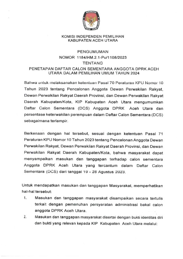 PENGUMUMAN NOMOR 1184/HM.2.1-Pu/1108/2023 TENTANG PENETAPAN DAFTAR CALON SEMENTARA ANGGOTA DPRK ACEH UTARA DALAM PEMILIHAN UMUM TAHUN 2024