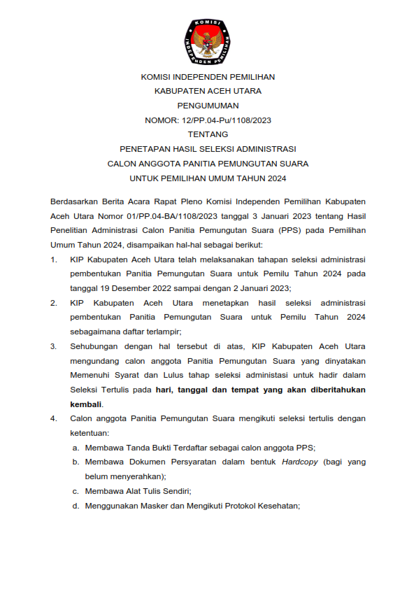 PENGUMUMAN NOMOR: 12/PP.04-Pu/1108/2023 TENTANG PENETAPAN HASIL SELEKSI ADMINISTRASI CALON ANGGOTA PANITIA PEMUNGUTAN SUARA UNTUK PEMILIHAN UMUM TAHUN 2024 Rabu, 04 Januari 2023 10:00 1080 Download Disini Bagikan: Dilihat 1,080 Kali.