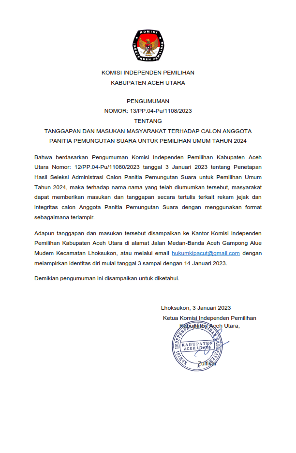 PENGUMUMAN NOMOR: 13/PP.04-Pu/1108/2023 TENTANG TANGGAPAN DAN MASUKAN MASYARAKAT TERHADAP CALON ANGGOTA PANITIA PEMUNGUTAN SUARA UNTUK PEMILIHAN UMUM TAHUN 2024 Rabu, 04 Januari 2023 10:05 2717 Download Disini Bagikan: Dilihat 2,717 Kali.