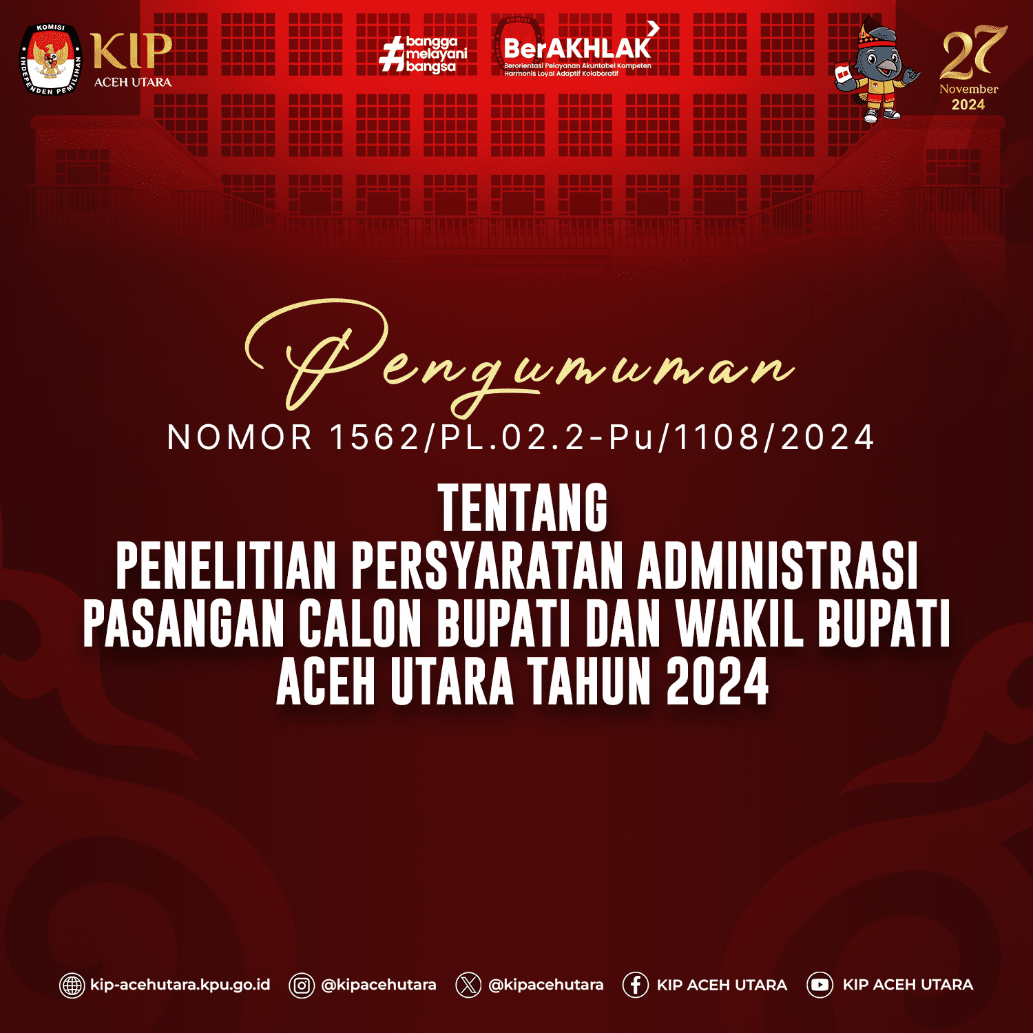 PENGUMUMAN NOMOR 1562/PL.02.2-Pu/1108/2024 TENTANG PENELITIAN PERSYARATAN ADMINISTRASI PASANGAN CALON BUPATI DAN WAKIL BUPATI ACEH UTARA TAHUN 2024