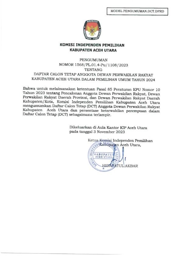 PENGUMUMAN NOMOR 1568/PL.01.4-Pu/1108/2023 TENTANG DAFTAR CALON TETAP ANGGOTA DEWAN PERWAKILAN RAKYAT KABUPATEN ACEH UTARA DALAM PEMILIHAN UMUM TAHUN 2024
