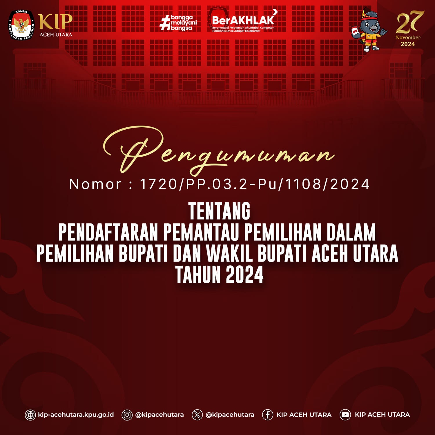 PENGUMUMAN Nomor : 1720/PP.03.2-Pu/1108/2024 Tentang Pendaftaran Pemantau Pemilihan Dalam Pemilihan Bupati dan Wakil Bupati Aceh Utara Tahun 2024