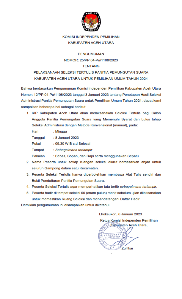 PENGUMUMAN NOMOR: 25/PP.04-Pu/1108/2023 TENTANG PELAKSANAAN SELEKSI TERTULIS PANITIA PEMUNGUTAN SUARA KABUPATEN ACEH UTARA UNTUK PEMILIHAN UMUM TAHUN 2024 Jumat, 06 Januari 2023 20:00 1943 Download Disini Bagikan: Dilihat 1,943 Kali.