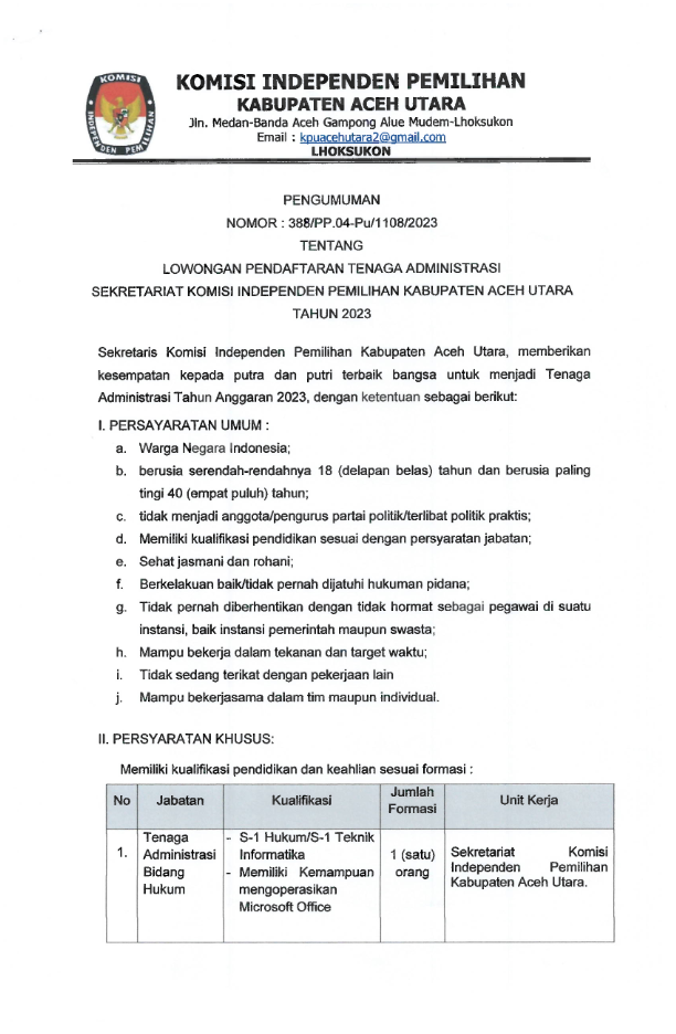 Pengumuman Nomor: 388/PP.04-Pu/1108/2023 Tentang Lowongan Pendaftaran Tenaga Administrasi Sekretariat Komisi Independen Pemilihan Kabupaten Aceh Utara Tahun 2023 Selasa, 07 Maret 2023 15:20 751 DOWNLOAD PENGUMUMAN DISINI DOWNLOAD DOKUMEN PERSYARATAN Bagikan: Dilihat 751 Kali.