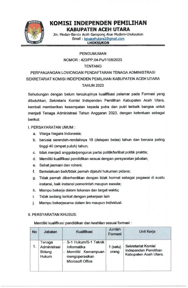 PENGUMUMAN NOMOR :423/PP-04-PU/1108/2023 TENTANG PERPANJANGAN LOWONGAN PENDAFTARAN TENAGA ADMINISTRASI SEKRETARIAT KOMISI INDEPENDEN PEMILIHAN KABUPATEN ACEH UTARA TAHUN 2023 Jumat, 10 Maret 2023 17:22 594 DOWNLOAD DISINI Bagikan: Dilihat 594 Kali.