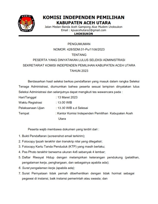 PENGUMUMAN NOMOR: 428/SDM.01-Pu/1108/2023 TENTANG PESERTA YANG DINYATAKAN LULUS SELEKSI ADMINISTRASI SEKRETARIAT KOMISI INDEPENDEN PEMILIHAN KABUPATEN ACEH UTARA TAHUN 2023 Minggu, 12 Maret 2023 15:12 707 DOWNLOAD DISINI Bagikan: Dilihat 707 Kali.