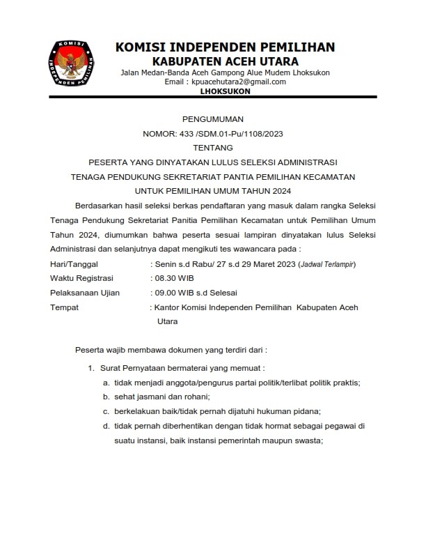 PENGUMUMAN NOMOR: 433 /SDM.01-Pu/1108/2023 TENTANG PESERTA YANG DINYATAKAN LULUS SELEKSI ADMINISTRASI TENAGA PENDUKUNG SEKRETARIAT PANTIA PEMILIHAN KECAMATAN UNTUK PEMILIHAN UMUM TAHUN 2024 Senin, 13 Maret 2023 20:56 778 DOWNLOAD DISINI Bagikan: Dilihat 778 Kali.