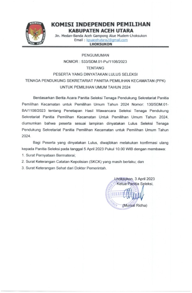 PENGUMUMAN NOMOR: 533/SDM.01-Pu/1108/2023 TENTANG PESERTA YANG DINYATAKAN LULUS SELEKSI TENAGA PENDUKUNG SEKRETARIAT PANITIA PEMILIHAN KECAMATAN UNTUK PEMILIHAN UMUM TAHUN 2024 Senin, 03 April 2023 18:00 801 DOWNLOAD DISINI Bagikan: Dilihat 801 Kali.