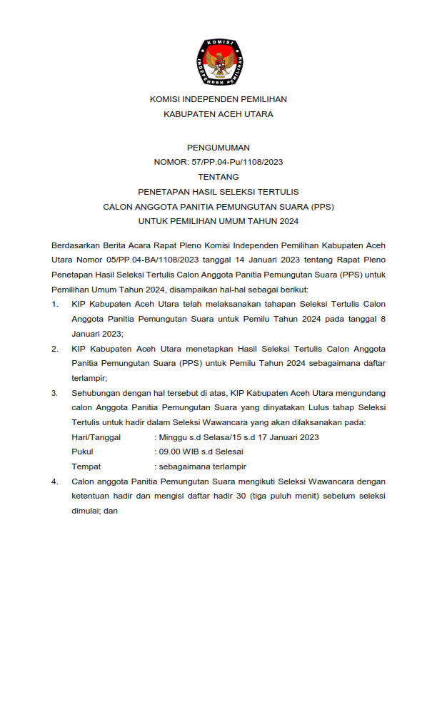PENGUMUMAN NOMOR: 57/PP.04-Pu/1108/2023 TENTANG PENETAPAN HASIL SELEKSI TERTULIS CALON ANGGOTA PANITIA PEMUNGUTAN SUARA (PPS) UNTUK PEMILIHAN UMUM TAHUN 2024 Sabtu, 14 Januari 2023 22:15 898 Download Disini Bagikan: Dilihat 898 Kali.