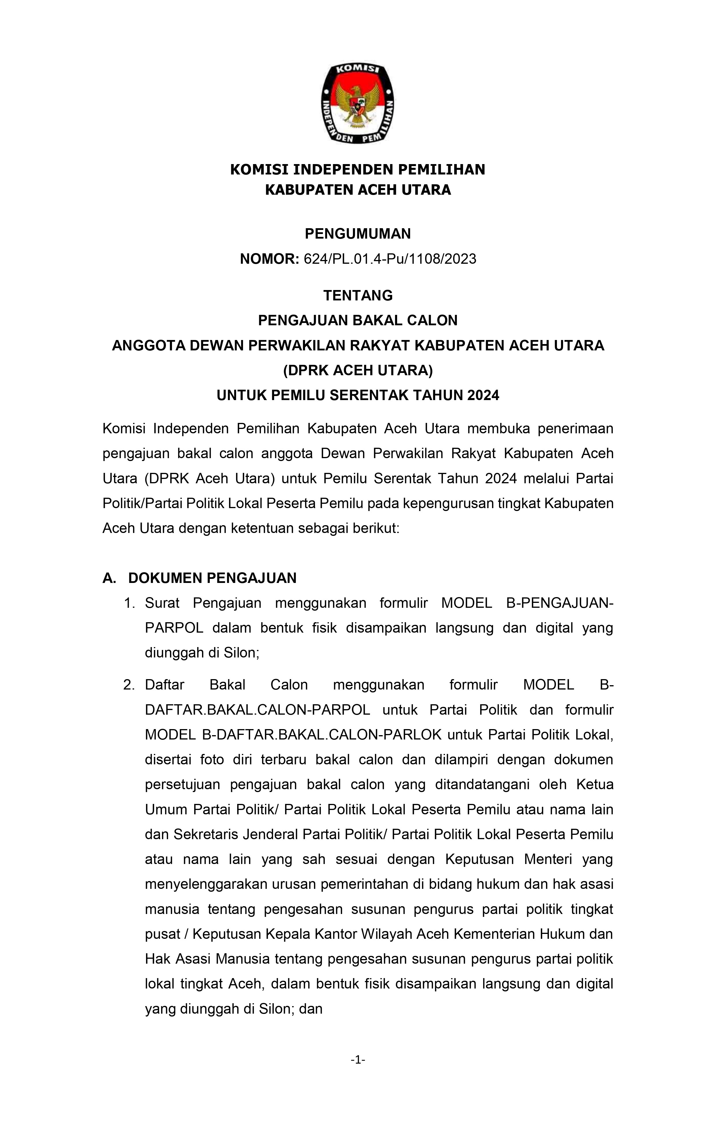 PENGUMUMAN NOMOR: 624/PL.01.4-Pu/1108/2023 TENTANG PENGAJUAN BAKAL CALON ANGGOTA DEWAN PERWAKILAN RAKYAT KABUPATEN ACEH UTARA (DPRK ACEH UTARA) UNTUK PEMILU SERENTAK TAHUN 2024 Senin, 24 April 2023 13:21 1916 DOWNLOAD DISINI Bagikan: Dilihat 1,916 Kali.