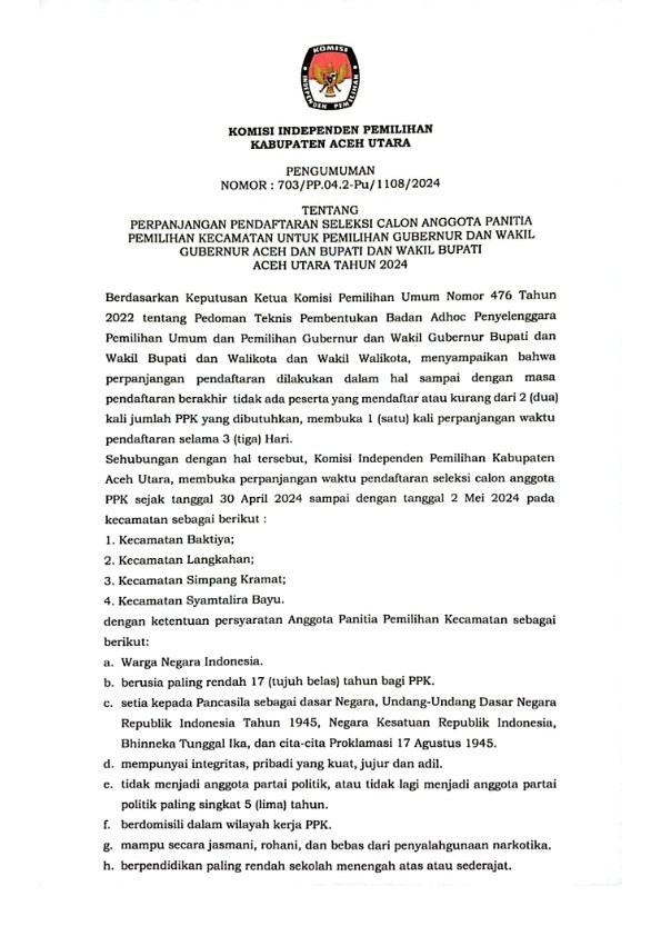 Sehubungan dengan hal tersebut, Komisi Independen Pemilihan Kabupaten Aceh Utara, membuka perpanjangan waktu pendaftaran seleksi calon anggota PPK sejak tanggal 30 April 2024 sampai dengan tanggal 2 Mei 2024 pada kecamatan sebagai berikut: