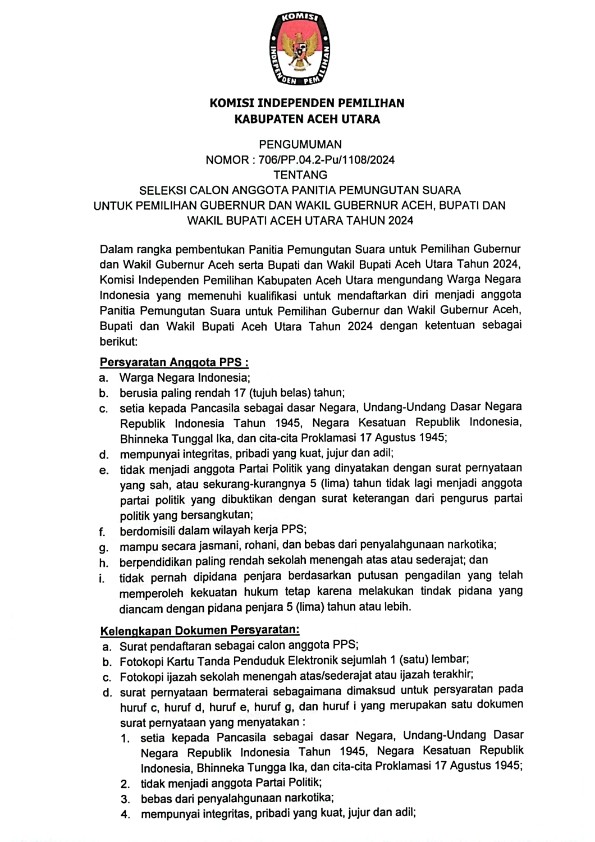 Dalam rangka pembentukan Panitia Pemungutan Suara untuk Pemilihan Gubernur dan Wakil Gubernur Aceh serta Bupati dan Wakil Bupati Aceh Utara Tahun 2024, Komisi Independen Pemilihan Kabupaten Aceh Utara mengundang Warga Negara Indonesia yang memenuhi kualifikasi untuk mendaftarkan diri menjadi anggota Panitia Pemungutan Suara untuk Pemilihan Gubernur dan Wakil Gubernur Aceh, Bupati dan Wakil Bupati Aceh Utara Tahun 2024 dengan ketentuan sebagai berikut :