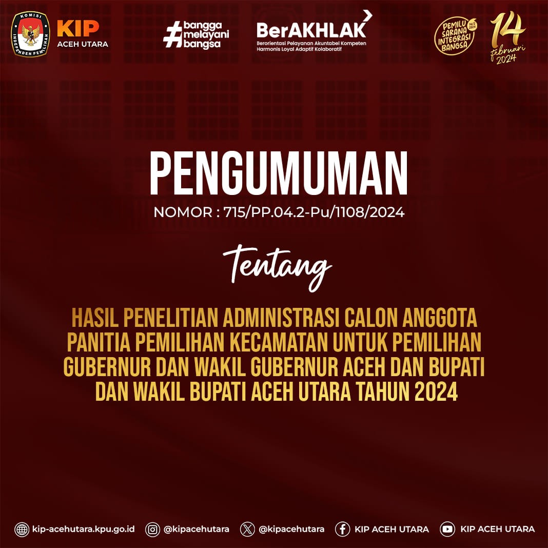 Sehubungan dengan Komisi Independen Pemilihan Kabupaten Aceh Utara telah melaksanakan tahapan Penelitian Administrasi Calon Anggota Panitia Pemilihan Kecamatan untuk Pemilihan Gubernur dan Wakil Gubernur Aceh, Bupati dan Wakil Bupati Aceh Utara Tahun 2024, disampaikan beberapa hal sebagai berikut: