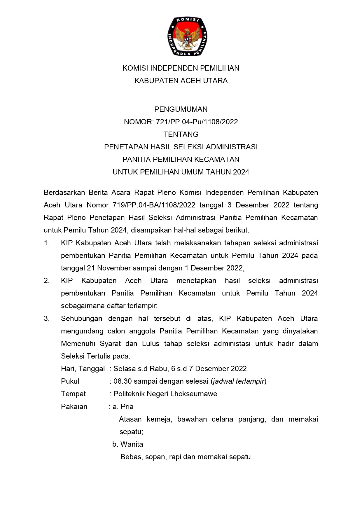 PENGUMUMAN NOMOR: 721/PP.04-Pu/1108/2022 TENTANG PENETAPAN HASIL SELEKSI ADMINISTRASI PANITIA PEMILIHAN KECAMATAN UNTUK PEMILIHAN UMUM TAHUN 2024 Sabtu, 03 Desember 2022 16:00 719 Download Disini Bagikan: Dilihat 719 Kali.