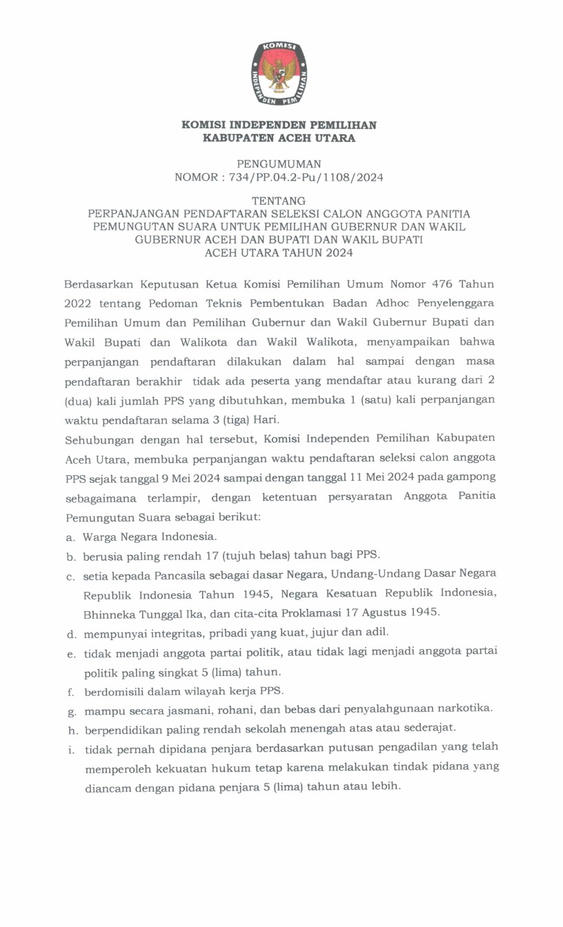 Sehubungan dengan hal tersebut, Komisi Independen Pemilihan Kabupaten Aceh Utara, membuka perpanjangan waktu pendaftaran seleksi calon anggota PPS sejak tanggal 9 Mei 2024 sampai dengan tanggal 11 Mei 2024 pada gampong sebagaimana terlampir, dengan ketentuan persyaratan Anggota Panitia Pemungutan Suara sebagai berikut:
