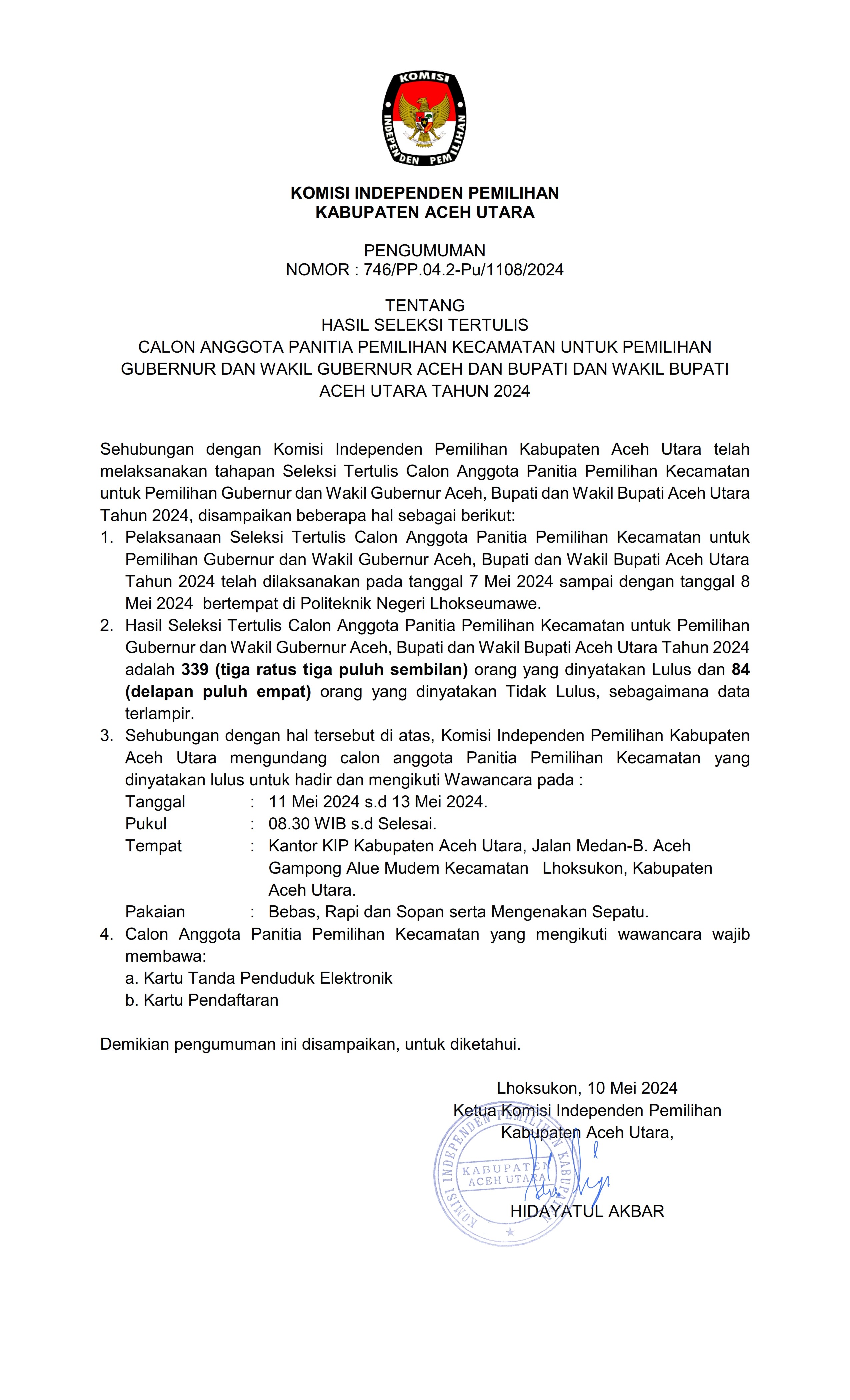 PENGUMUMAN NOMOR : 746/PP.04.2-Pu/1108/2024 TENTANG HASIL SELEKSI TERTULIS CALON ANGGOTA PANITIA PEMILIHAN KECAMATAN UNTUKPILKADA TAHUN 2024