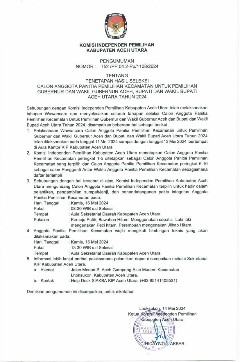 PENGUMUMAN NOMOR: 752/PP.04.2-Pu/1108/2024 TENTANG PENETAPAN HASIL SELEKSI CALON ANGGOTA PANITIA PEMILIHAN KECAMATAN PILKADA TAHUN 2024