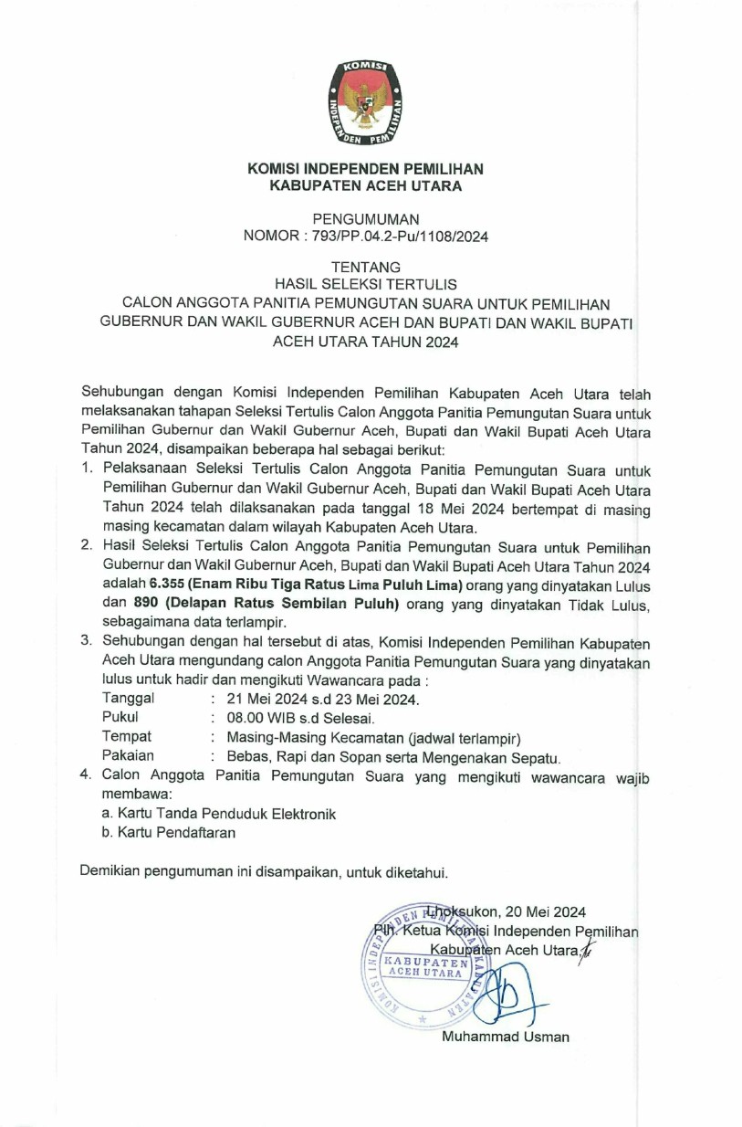 Sehubungan dengan Komisi Independen Pemilihan Kabupaten Aceh Utara telah melaksanakan tahapan Seleksi Tertulis Calon Anggota Panitia Pemungutan Suara untuk Pemilihan Gubernur dan Wakil Gubernur Aceh, Bupati dan Wakil Bupati Aceh Utara Tahun 2024, disampaikan beberapa hal sebagai berikut: