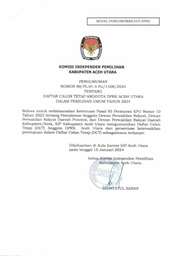 PENGUMUMAN NOMOR 80/PL.01.4-Pu/1108/2024 TENTANG DAFTAR CALON TETAP ANGGOTA DPRK ACEH UTARA DALAM PEMILIHAN UMUM TAHUN 2024