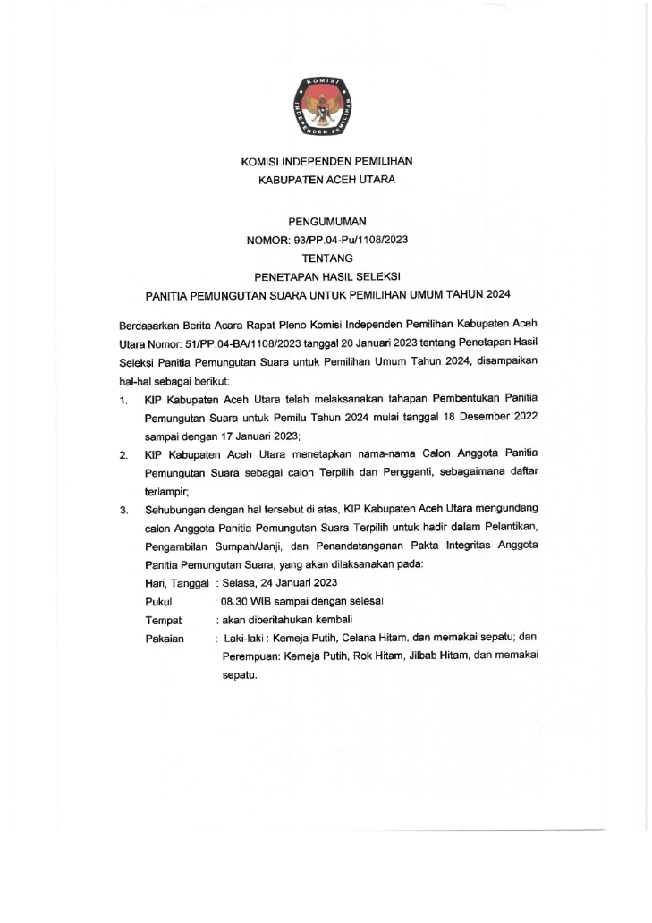 PENGUMUMAN NOMOR: 93/PP.04-Pu/1108/2023 TENTANG PENETAPAN HASIL SELEKSI PANITIA PEMUNGUTAN SUARA UNTUK PEMILIHAN UMUM TAHUN 2024 Jumat, 20 Januari 2023 23:42 1244 Download Disini Bagikan: Dilihat 1,244 Kali.
