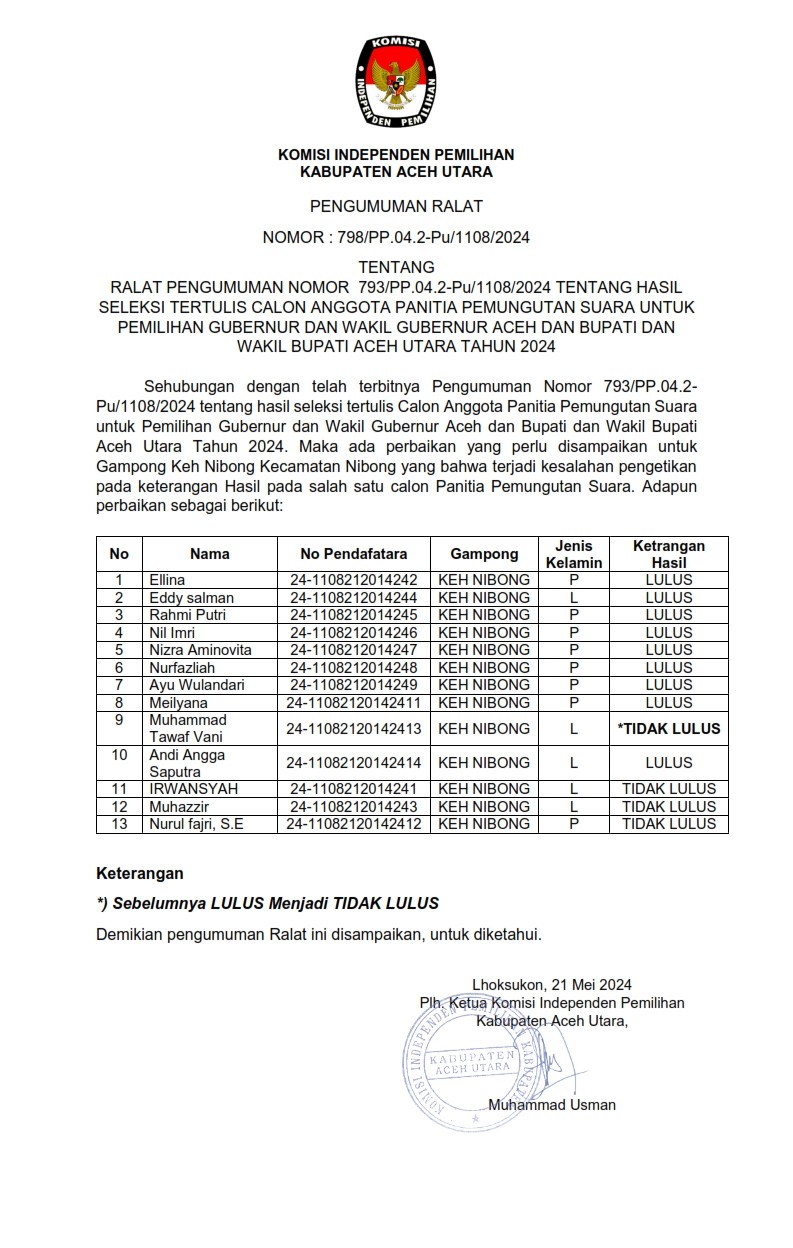 Sehubungan dengan telah terbitnya Pengumuman Nomor 793/PP.04.2-Pu/1108/2024 tentang hasil seleksi tertulis Calon Anggota Panitia Pemungutan Suara untuk Pemilihan Gubernur dan Wakil Gubernur Aceh dan Bupati dan Wakil Bupati Aceh Utara Tahun 2024. Maka ada perbaikan yang perlu disampaikan untuk Gampong Keh Nibong Kecamatan Nibong yang bahwa terjadi kesalahan pengetikan pada keterangan Hasil pada salah satu calon Panitia Pemungutan Suara. Adapun perbaikan sebagai berikut: