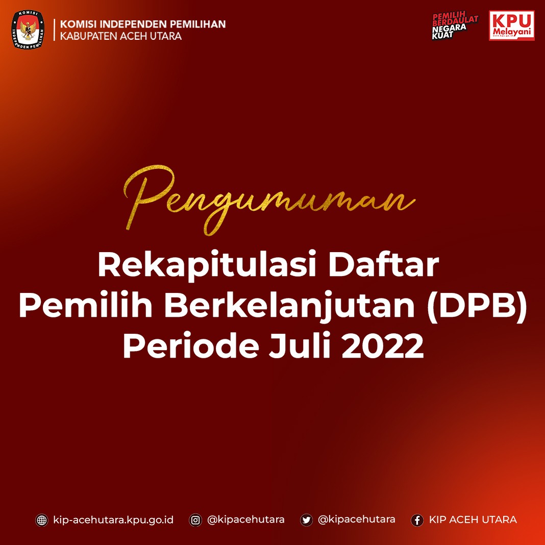 Rekapitulasi Daftar Pemilih Berkelanjutan (DPB) Periode Juli 2022 Selasa, 02 Agustus 2022 00:00 369 Rekapitulasi Daftar Pemilih Berkelanjutan (DPB) Periode Juli 2022 Bagikan: Dilihat 369 Kali.